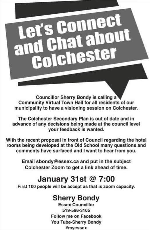 Councillor Sherry Bondy is calling a community Virtual Town Hall via zoom for all residents of our municipality to have a visioning session on Colchester. The Colchester secondary plan is out of date and in advance of any decisions being made at the council level your feedback is wanted.