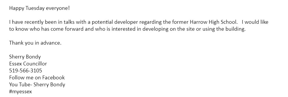 I am adamant that using the former Harrow High School will be our one and only chance at a community hub/recreational center. That does not mean I do not think we could sell off a section of the building for private use but I think we need to keep the community use areas like the gym and cafeteria. I have asked Town of Essex Administration who they have been entertaining and working with in the private sector because I believe we owe it to the people in our community to be fully transparent with whatever we have in the works. I personally have talked to one group who is interested in making the school into two story housing. I believe there are better locations for housing- anywhere but our recreational core. I explained this to the group I talked to. Who is talking to who and who is planning what? Good question.