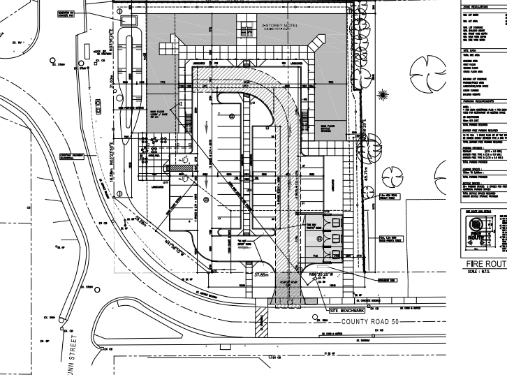 municipally as 96 County Road 50 West. A two-storey Motel development with twenty-eight (28) guestrooms including a 58 square metre café with outdoor patio area, and, an ancillary parking area to accommodate a total of thirty-four (34) parking spaces, including two (2) accessible parking spaces and two (2) bicycle parking spaces (indoor bicycle storage facilities are also proposed)”.