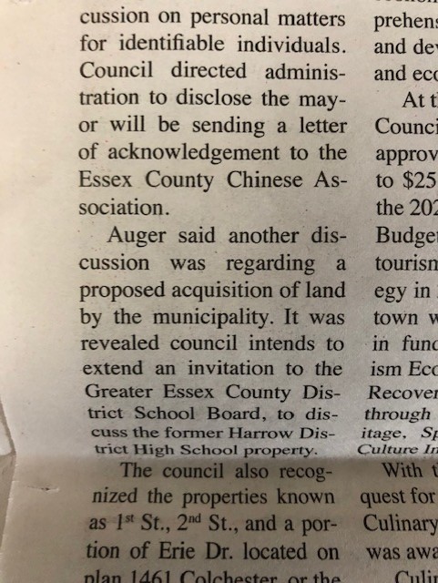 Essex Town Council is looking to meet with the Greater Essex County District School Board about the closed Harrow High School Building and Land.
