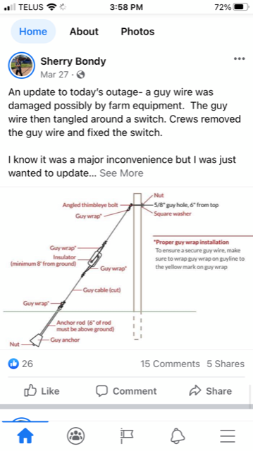 For anyone who follows me on social media knows I move fast and from topic to topic. There is no way a meme shared 3 days later (about me!) was intended to be aimed at ELK Energy. I knew it was not ELK’s fault and shared with everyone it was the cause of a downed guy wire.