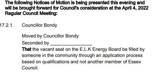 “That the vacant seat on the E.L.K Energy Board be filled by someone in the community through an application process based on qualifications and not another member of Essex Council”.