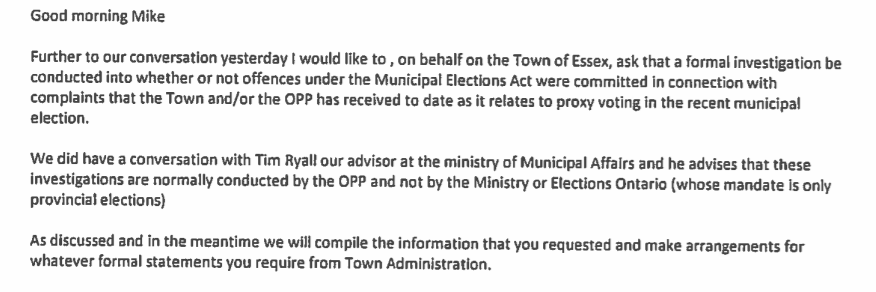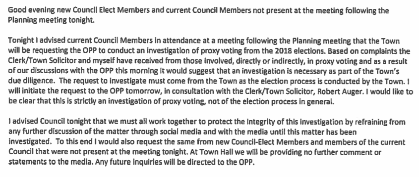 Email to New Council Informing that OPP are Taking Over: Oct 29th, 2018.